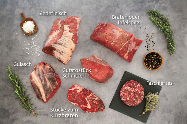 Jetzt anfragenDoppelte Genussvielfalt in BIO-Qualität! Enthält: Gustostück (Schnitzel), Rostbraten oder Beiried, Bratenstück, Tafelspitz, Gulasch, Faschiertes und Suppenfleisch.